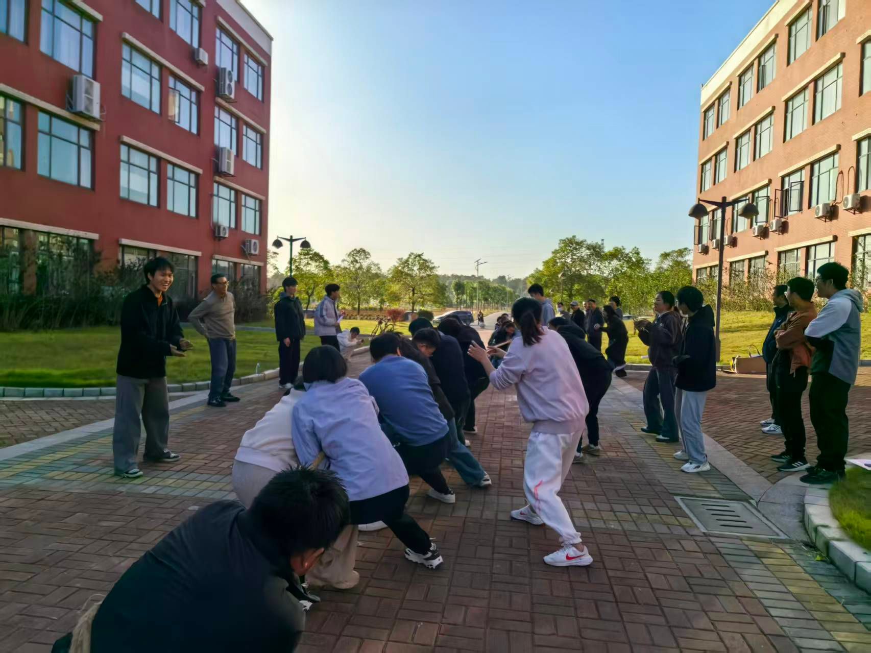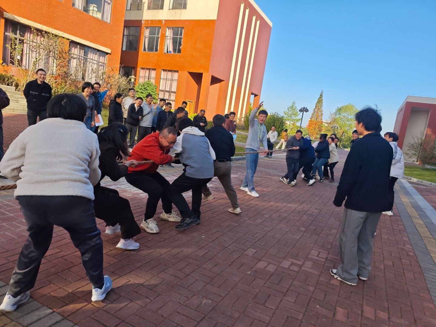 随着裁判一声哨响,首场比赛正式开始。“一二!一二!”的助威口号瞬间响彻现场,各队队员紧握长绳,双脚蹬地,身体后倾,使出浑身力气往后拉扯。场边,未参赛的教职工自发组成啦啦队,挥舞着双手呐喊助威,加油声、欢呼声与绳子摩擦地面的声响交织在一起,形成了热烈非凡的赛场氛围。每一位队员都以最饱满的状态投入比赛,每一支队伍都展现出顽强拼搏的体育精神,充分彰显了新能源人团结协作、永不言弃的奋进姿态。