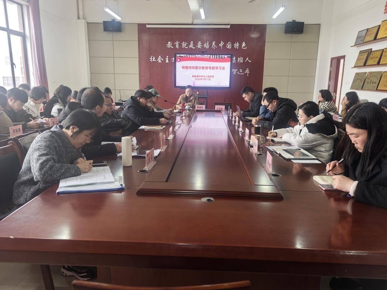 会上集中观看了《依法规范执教师德警示教育——师德失范典型案例》(高校篇)警示教育、廉洁教育短视频,通过真实案例的生动呈现、深刻剖析师德失范行为的严重危害,为全体教职工敲响廉洁从教的思想警钟。同时,学院副院长欧阳昆结合身边典型案例,涵盖违背党的路线方针政策言行、违反教学纪律、学术不端、不当师生关系等多个方面进行剖析,让全体教职工深刻认识到师德师风失范行为的严重后果,以及加强师德师风建设的重要性和紧迫性。