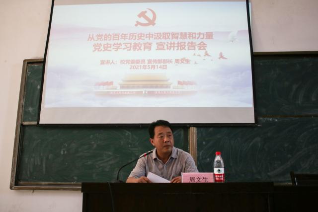 为深入学习贯彻习近平总书记在党史学习教育动员大会上的重要讲话精神,使广大师生把习近平总书记的重要讲话精神和关于党的历史的重要论述学懂弄通,把中国共产党为什么“能”、马克思主义为什么“行”、中国特色社会主义为什么“好”学深学透,并从党的百年光辉历程中汲取智慧和力量,为“十四五”开好局、起好步凝聚强大力量,5月14日下午校党委委员、宣传部部长周文生应邀来到yl7703永利集团开展题目为《从党的百年历史中汲取智慧和力量》的党史学习教育专题宣讲。yl7703永利集团教师代表、学生党员和入党积极分子共计100余人参加了此次宣讲会。