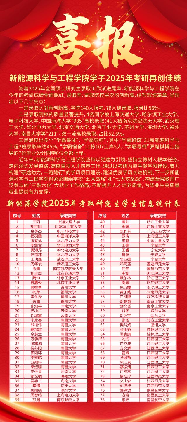 三是涌现出多个“学霸集体”、“学霸导师”,其中“学霸班级”21新能源科学与工程2班录取率达45%,“学霸宿舍”11栋107上岸5人、“学霸导师”罗胤祺博士指导的7位毕业设计同学6位全部上岸。