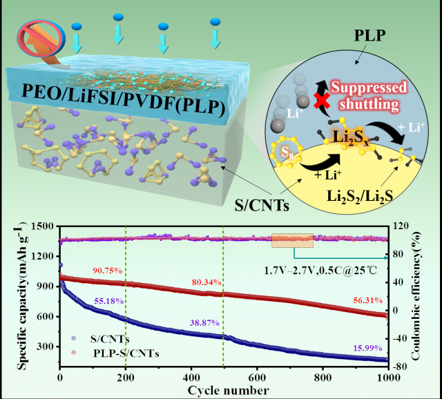 针对这一问题,我校教师李玲在攻读博士期间研究并制备一种复合涂层用于硫碳电极,与传统的硫电极相比,这种改性电极上的复合涂层可以抑制PEO基中可溶性PEO-Li2Sx(x>4)的产生,减少活性物质的损失,同时涂层中的组份可以促使多硫化物不生成可溶性的多硫化物而直接转化为Li2S2/Li2S,抑制穿梭效应,提升锂硫电池循环稳定性的效果。所使用的退火工艺可以处理凝胶涂层引发的不同相结构之间的 Li+浓差扩散,抑制凝胶涂层中聚合物结晶,从而提复合电极的电子和离子导电率,使锂硫电池表现出优异的倍率性能和循环性能。这项研究成果发表在国际著名期刊《先进工程材料》上。
