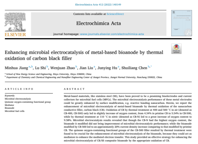 近日,我院教师江民华博士以第一作者在电化学领域国际权威刊物《Electrochimica Acta》(影响因子IF=6.9)上以“Enhancing microbial electrocatalysis of metal-based bioanode by thermal oxidation of carbon black filler”为题发表最新研究成果(DOI: 10.1016/j.electacta.2022.140149)。
