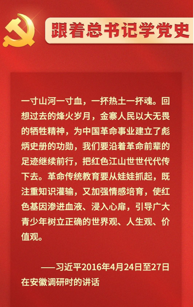 金寨是中国革命的重要策源地、人民军队的重要发源地,先后有12支主力红军队伍在这里建立,被誉为“中国红军第一县”,是全国为数不多的历经大革命、土地革命、抗日战争和解放战争各个时期,21年革命武装斗争持续不断、28年革命红旗始终高高飘扬的革命根据地。长期的革命斗争、伟大的革命实践,不仅给金寨人民留下了丰富多彩、积淀深厚的红色文化资源,而且孕育和铸造了“坚贞忠诚、牺牲奉献、一心为民、永跟党走”的高尚品质。