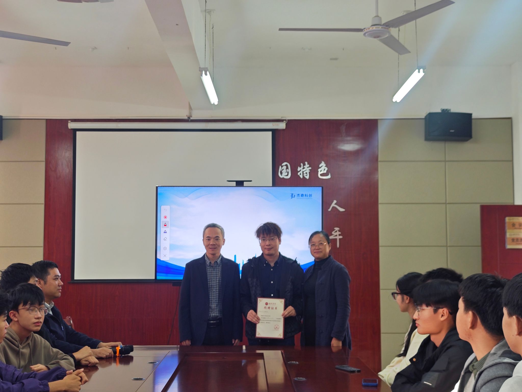 最后,吴志鹏向学院捐赠了40台智能教学投影仪,价值11万多元,吴志鹏表达了对母校培养的感激之情,他表示,母校“求新、求实、求善”的校训精神一直激励着自己前行,此次捐赠是略尽绵薄之力,助力学院发展更上一层楼。陈莲香书记、王发辉院长代表学院接受了捐赠,并给吴志鹏校友颁发了捐赠证书。他们强调,校友是学院最宝贵的财富和发展的不竭动力,吴志鹏校友的成功创业和反哺母校的行为,以实际行动诠释了校友对母校的深情厚谊与社会责任感,为在校学子树立了学习的榜样。